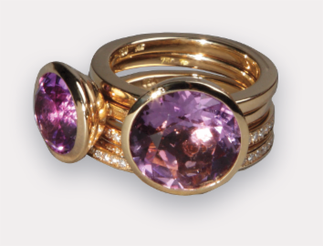 Das innovative Design der Wunschringe von Rotraut Hoffmann hat bereits die Schmuckträume vieler Trägerinnen erfüllt… und neue Wünsche geweckt. Zeit also für die nächste Generation der Wunschringe – nun aus 18-karätigem Gold. Im Mittelpunkt steht ein über 14-karätiger, rund geschliffener Edelsteinsolitär – hier ein Amethyst. Ihn umgeben 8 weitere in 18 Karat Gold gefasste Edelsteine, wobei sich rund geschliffene Aquamarine abwechseln mit größeren, oval geschliffenen Citrinen. Bei der Zusammenstellung der Edelsteine geht Rotraut Hoffmann gern auf persönliche Wünsche ein. Durch seine expressive Farbigkeit verleiht der Wunschring jeder Garderobe einen unnachahmlichen Akzent, ob klassisches Kostüm oder Abendkleid, Après-Ski oder Theater.